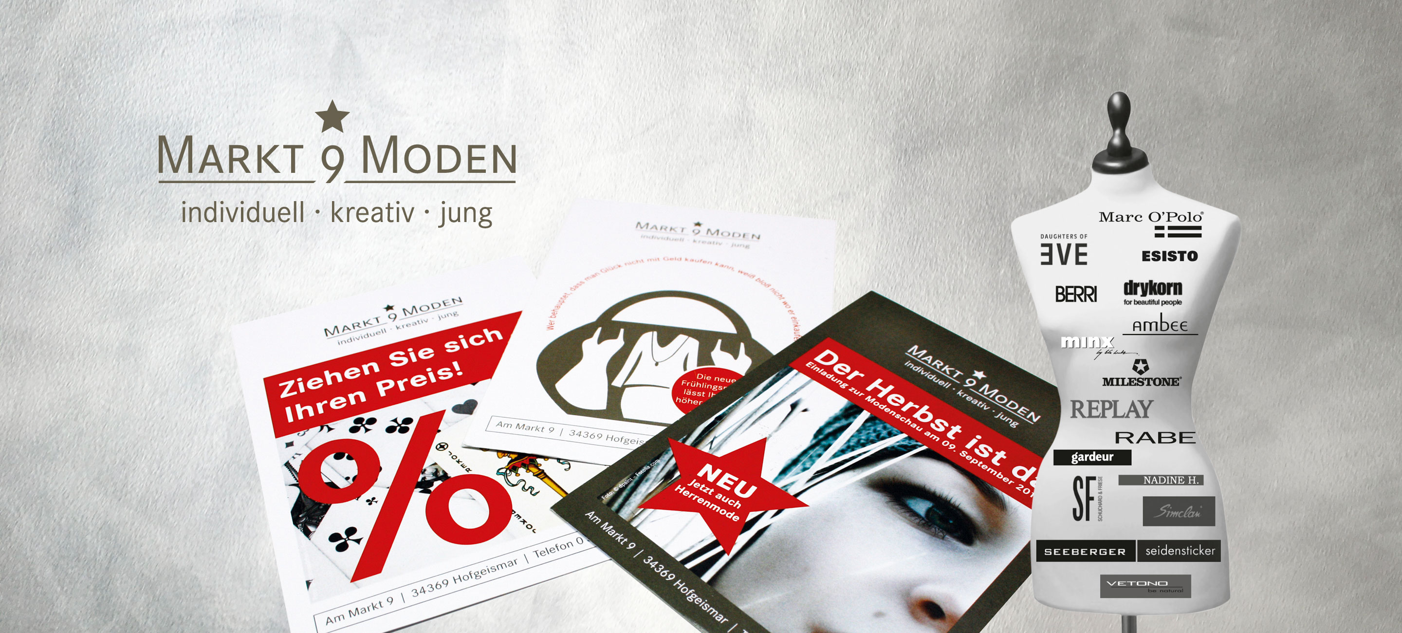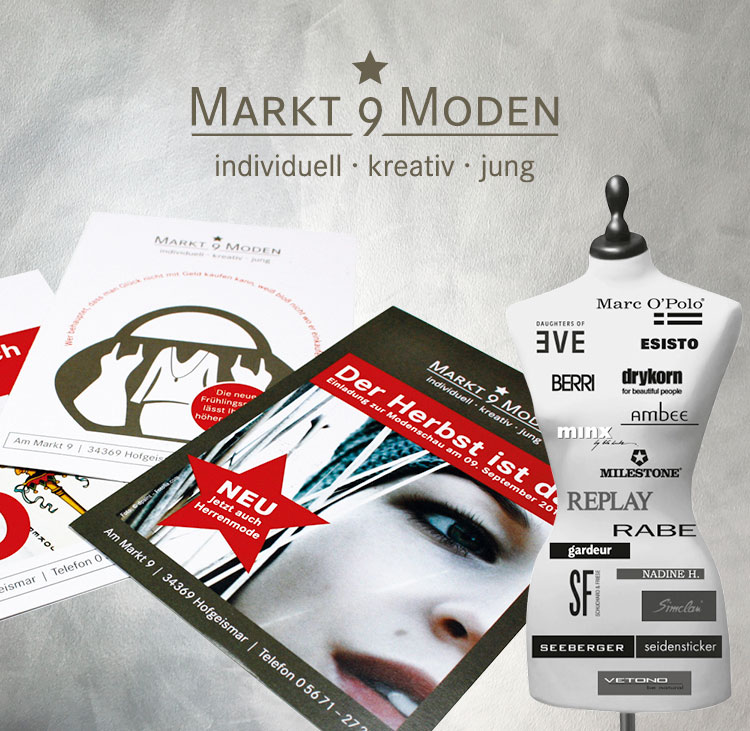 Unter der Vorgabe „Werbung, die auffällt und zugleich dem Stil und der Qualität der Ware gerecht wird.“ lassen viele schöne Mailings und Karten die Herzen der Kunden von Markt 9 Moden höher schlagen. Desweiteren weisen Anzeigen in regionalen Zeitungen auf Events und Aktionen hin.