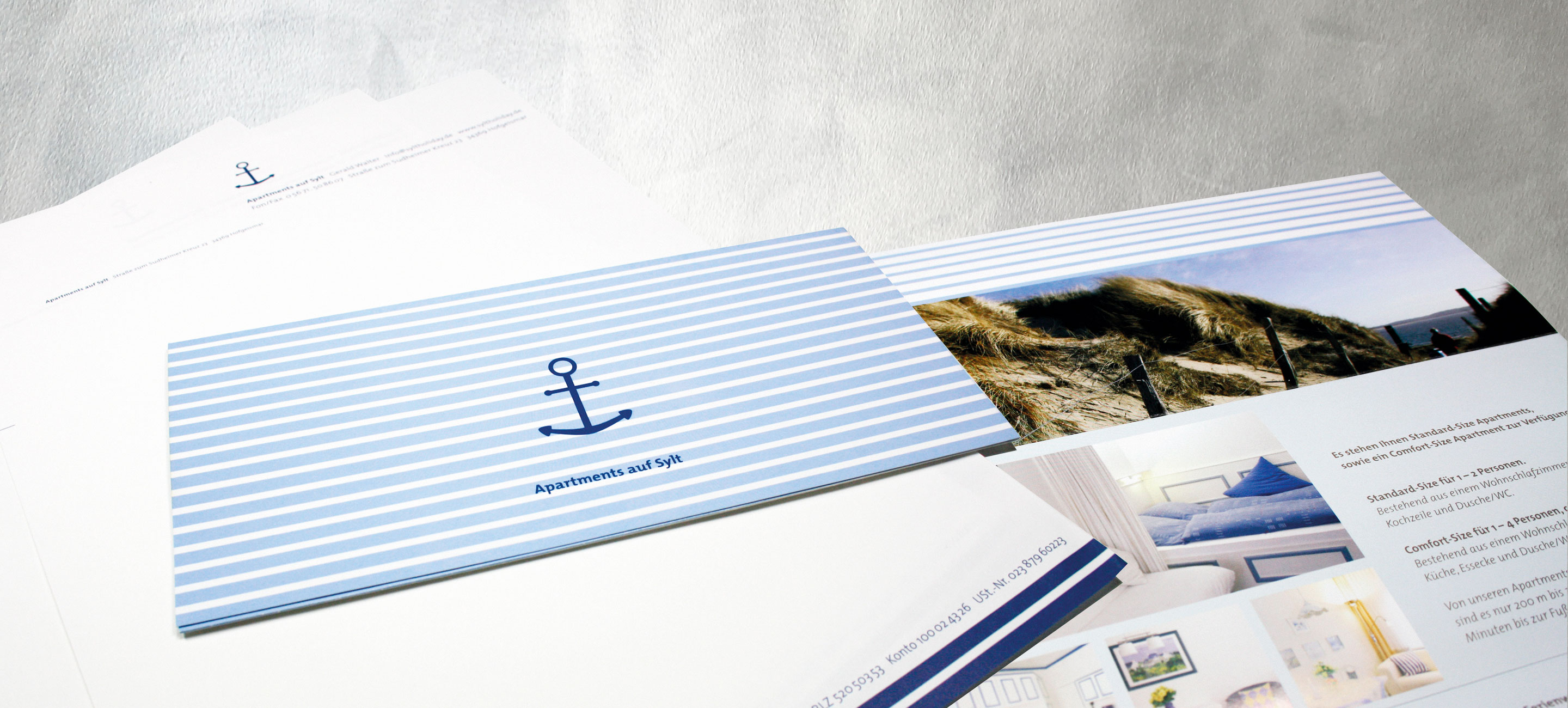 Frisch und maritim kommen die Drucksachen von Syltholiday daher. Im Flyer werden die ruhigen, strandnahen Apartments in Westerland ausführlich in Bild und Text wiedergegeben.
