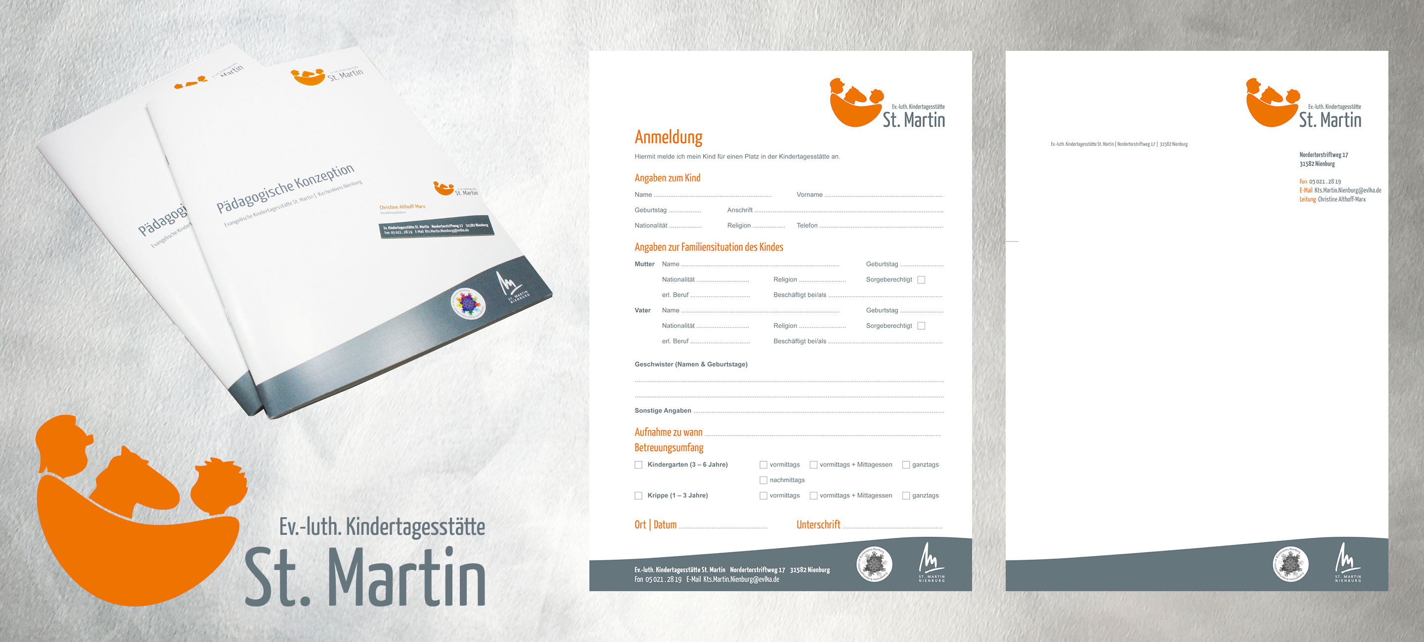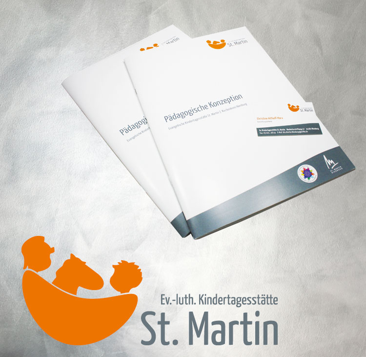 St. Martin war der dritte Bischof von Tours. Er ist einer der bekanntesten Heiligen und Namensgeber der Kita. Annähernd jedes Kind kennt die Geschichte. Das Logo stellt St. Martin mit Ross und Mantel sowie den Bettler dar. Dass aber auch zwei spielende Kinder in einer Wippe/Nestschaukel mit Steckenpferd gesehen werden, ist beabsichtigt. Runde, weiche Formen und ein warmer Orangeton ergänzen das Design.