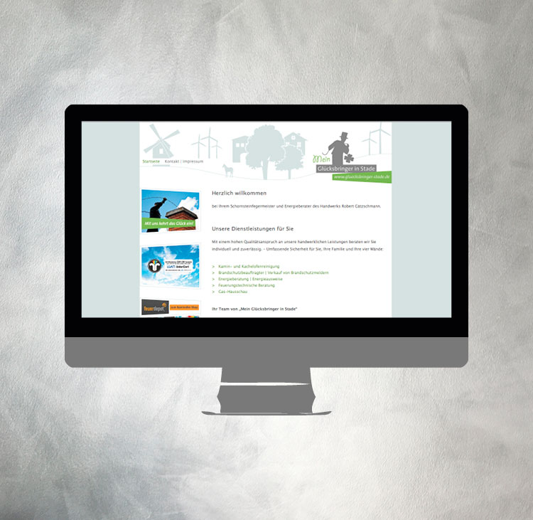 Wenn früher Kamine verstopft waren oder nicht mehr richtig zogen, wurde es kalt im Haus und es konnte kein Essen zubereitet werden. Im schlimmsten Fall entzündete sich der Ruß und das Haus/das ganze Dorf brannte. Noch in der heutigen Zeit gilt der Schornsteinfeger als Glücksbringer. Das Arbeitsfeld ist jedoch deutlich umfangreicher geworden. „Mit uns kehrt das Glück ein“ so lautet der Slogan von „Mein Glücksbringer in Stade“. Charmant präsentiert, zieht sich eine grün-graue Linie durch alle Bereiche von Visitenkarten, Flyer über Website und Autobeschriftung.