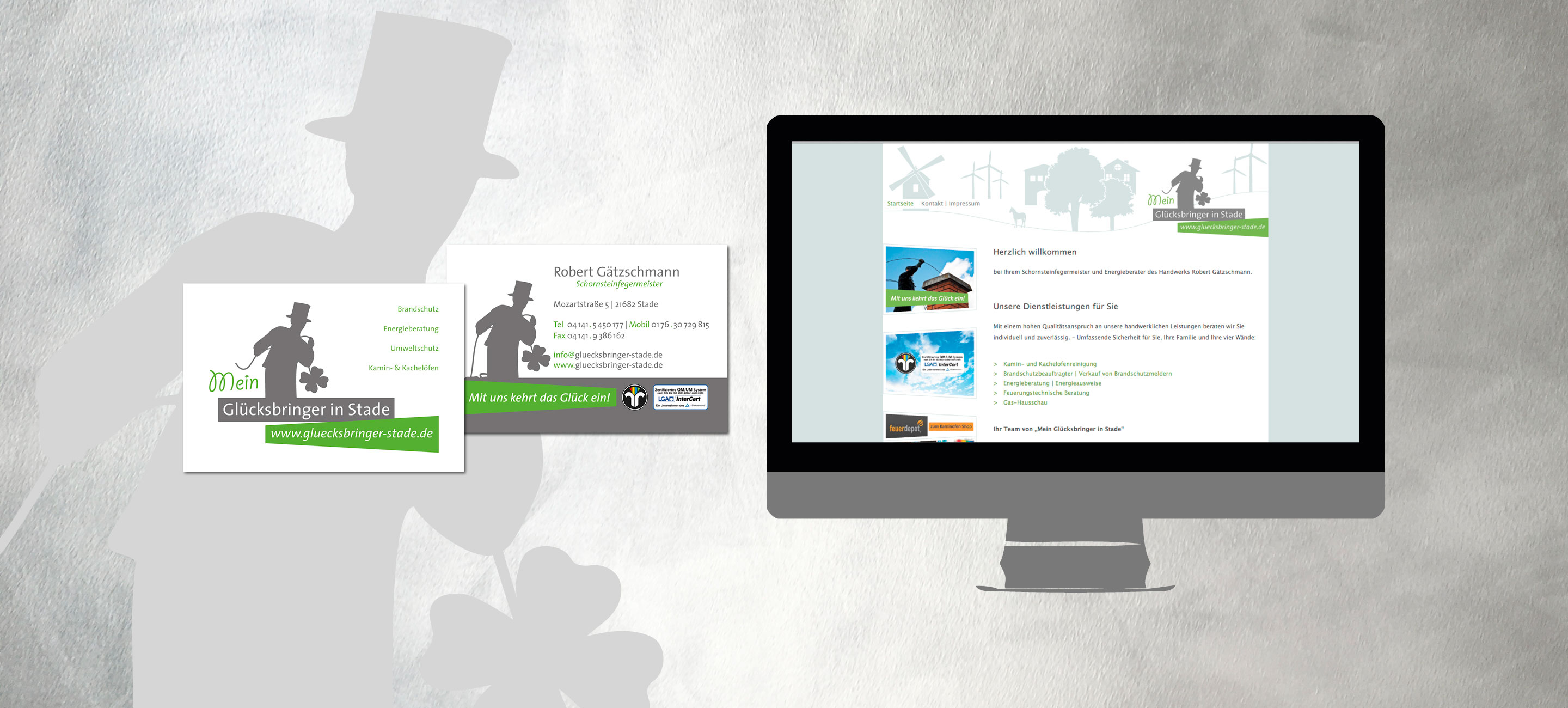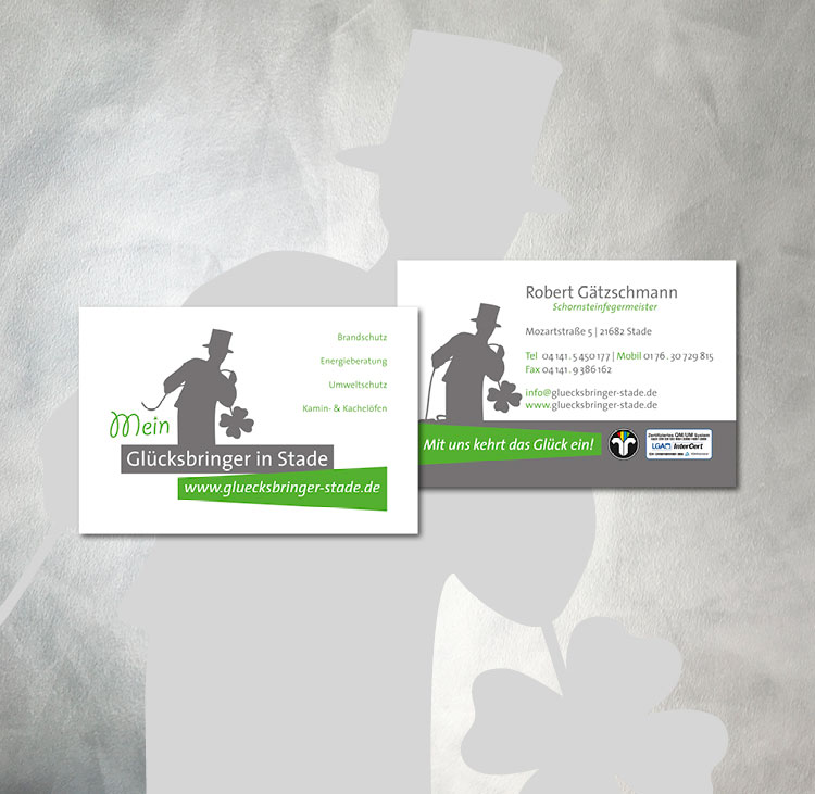 Wenn früher Kamine verstopft waren oder nicht mehr richtig zogen, wurde es kalt im Haus und es konnte kein Essen zubereitet werden. Im schlimmsten Fall entzündete sich der Ruß und das Haus/das ganze Dorf brannte. Noch in der heutigen Zeit gilt der Schornsteinfeger als Glücksbringer. Das Arbeitsfeld ist jedoch deutlich umfangreicher geworden. „Mit uns kehrt das Glück ein“ so lautet der Slogan von „Mein Glücksbringer in Stade“. Charmant präsentiert, zieht sich eine grün-graue Linie durch alle Bereiche von Visitenkarten, Flyer über Website und Autobeschriftung.