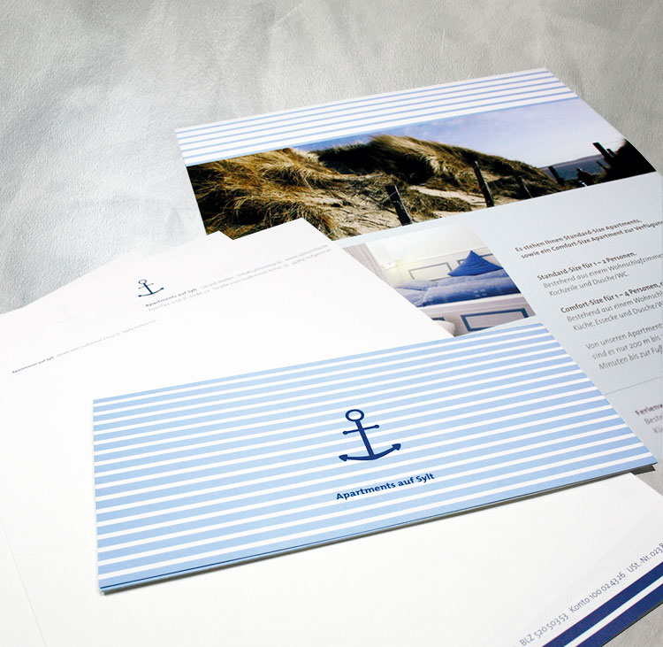 Frisch und maritim kommen die Drucksachen von Syltholiday daher. Im Flyer werden die ruhigen, strandnahen Apartments in Westerland ausführlich in Bild und Text wiedergegeben.